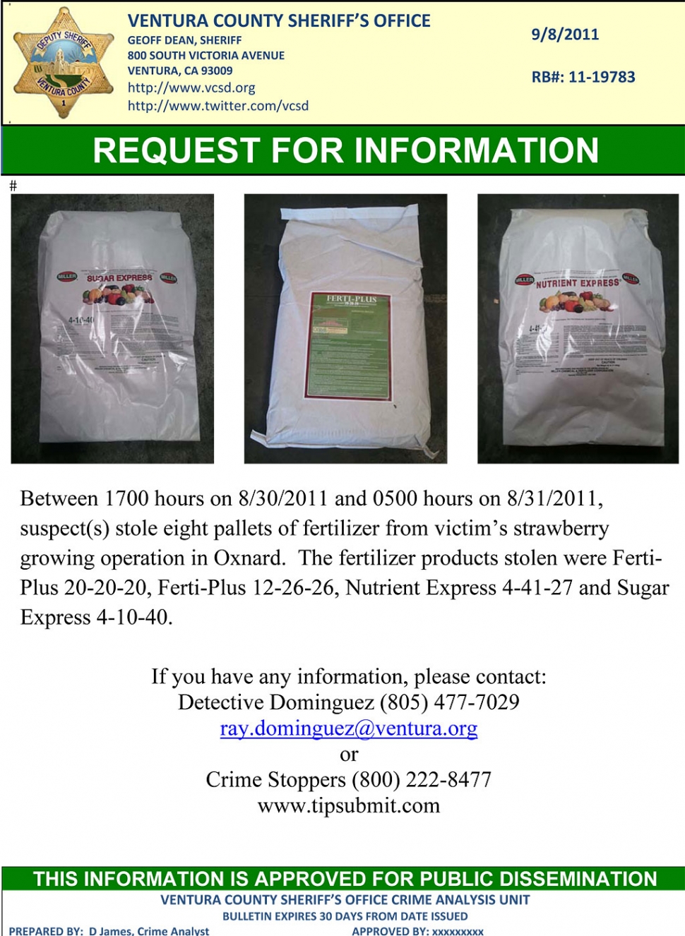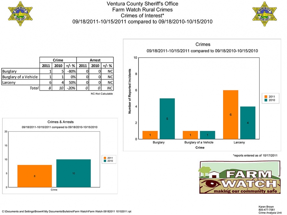 ![]() ![]() ![]() Welcome Farm Watch subscribers to this Fall Edition. The good news is that total crime rates in the Agricultural communities in Ventura County were down overall. The main areas of concern continue to be metal thefts (all kinds) and a slight rise in conex storage box thefts. We are tracking all of the reports to identify specific trends and to develop leads for potential suspects. The entire county seems to fall victim of the random thefts, therefore developing solid leads can be difficult. Please continue to call in ANY suspicious persons / vehicles that should not be on your property or perhaps in the general area. The overall theme to the crime issues listed below is theft of metals, where the suspects clearly steal a variety of items from sprinkler heads to hoop house support posts. This trend is state-wide and our officers have been on alert for this type of theft which has plagued our county for several months now. We have had some success in arresting and prosecuting these criminals, however, they are just so dominant county-wide, that we truly rely on our citizens to call if they see anything at all suspicious. The following were reported crimes specific to our agricultural communities: On Cawelti Road in the unincorporated area of Camarillo, a large farm was the victim of a grand theft of irrigation equipment / supplies. The victim believes the suspect(s) may have been working from a “Shopping list” as they were selective in what they stole. Theft of Hoop House Support Posts: A flower nursery located on Santa Rosa Rd. was the victim of a grand theft of new steel green hoop house support posts. The new posts were delivered a few days prior to the reported theft. On Wood Rd. near Pacific Coast Highway, a local business was the victim of a fertilizer theft. The suspect(s) entered via a neighboring farm road and accessed the victim’s outdoor storage area by cutting through a perimeter chain link fence. See attached flyer for details. A second theft of Hoop House Support Posts: A nursery located on Santa Rosa Rd. was the victim of a grand theft of approximately 4000 steel hoop house support posts. The suspects(s) cut a chain link fence and entered the property from an adjacent lemon orchard. Some of the posts were located at a local recycling center in Oxnard and suspects have been identified. This is an on-going investigation that will likely lead to multiple arrests. Landscape equipment stolen from Grand Ave. in Fillmore where the suspect(s) forced entry into the victim’s storage yard and stole various pieces of landscaping equipment. Venco Western Co. had their storage yard located on Tierra Rejada Rd. in Moorpark targeted for a burglary. Unknown suspects forced entry into the yard by removing the chain link gates and entering a conex storage container. The suspects forced entry into a large truck that was parked in front of the storage container doors and pushed out of the way. The suspects stole various items of high-end landscape equipment including gas-powered mowers, blowers, edgers and trimmers. Oceanview Produce – located on Sturgis Rd. in Oxnard was the victim of a grand theft of brass sprinkler heads. The suspect(s) snapped the sprinkler heads off of the risers and rendered them useless. It appears the sprinkler heads were taken and will most likely be taken to a recycling center to be sold as scrap metal. Prevention Tips: As always, the Sheriff’s Office encourages you to take preventive measures to secure and protect your property including the use of high quality locks, security lighting, surveillance cameras, and marking your property with identifiable numbers. In addition, please order only what you need and avoid stockpiling supplies because doing so will only make your operation more attractive to thieves. If you must keep large supplies on hand, please ensure that they are kept out of sight and in a secure facility. Contacts: Fillmore Detective Darin Hendren darin.hendrin@ventura.org or 524-2235 Ventura Detective Christine Rettura Christine.rettura@ventura.org 662-6770 Agricultural Crimes Detective, Ray Dominguez at Ray.Dominguez@ventura.org Camarillo Detective Nora Soler, at Nora.soler@ventura.org I would like to thank Sheriff’s Crime Analyst Karen Brown who puts together your maps and digests all the crime data along with Det. Ray Dominguez who assists tremendously with the crime summaries. Be alert and always safe! Monica (797-6338) Geoff Dean - Sheriff |