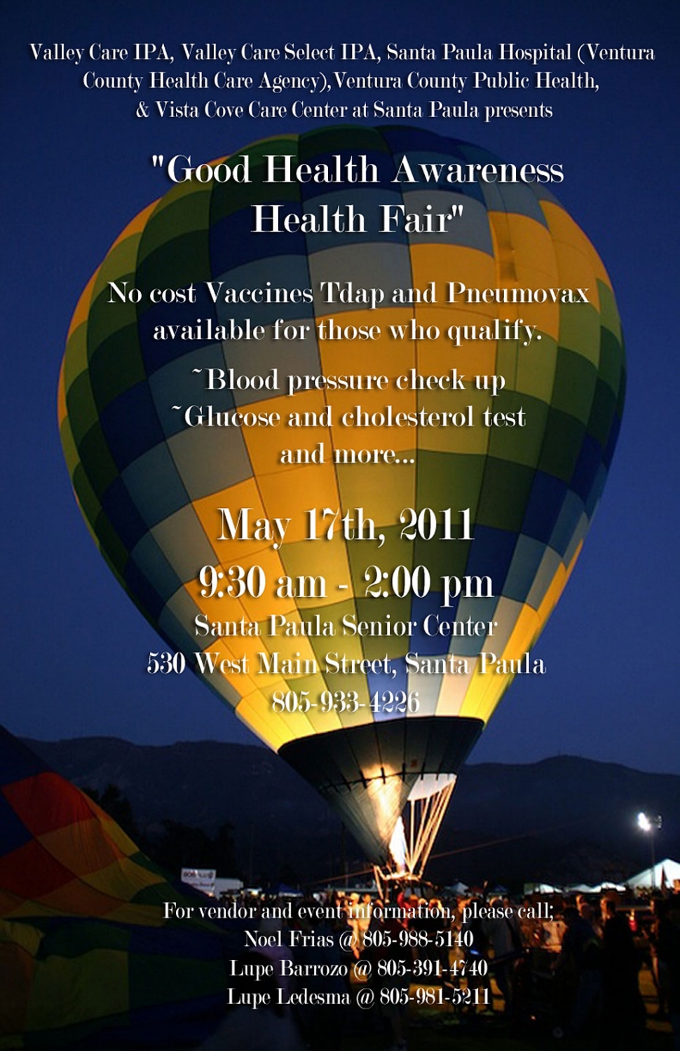 On Tuesday, May 17th from 9:30 AM to 2:00 PM, join us for the “Good Health Awareness Health Fair at the Santa Paula Senior Center (Community Center) located at 530 West Main Street, Santa Paula. This event is FREE and hosted by Valley Care IPA, Valley Care Select IPA, Santa Paula Hospital (Ventura County Public Health Care Agency), Ventura County Public Health and Vista Cove Care Center at Santa Paula. There will be lots of great information booths about Good Health and services to keep you healthy by local agencies around the city and county. Also available through Ventura County Public Health will be no cost Vaccines Tdap and Pneumovax (available to those who qualify), blood pressure check up, Glucose and cholesterol test and more. There will also be free small boxed lunches to the first 100 attendees that are 65 years or older. This Fair is for all ages as is Good Health! For more information you may contact Noel Frias (Valley Care IPA) 988-5140, Lupe Ledesma (V.C. Public Health) 981-5211 or Lupe Barrozo (Vista Cove Care Center at Santa Paula) 391-4740 or 525-7134. |