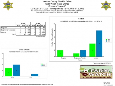 WELCOME FARM WATCH READERS! Detective Ray Dominguez had the following to report for this edition: Happy New Year Farm Watch readers, I hope all of you are off to a good start this year. As I mentioned in the last edition, I have been working on the Owner Applied Number Program, and all the renewal letters have been sent out. If you currently have an OAN, but did not receive a letter please contact me at (805) 384-4726 or ray.dominguez@ventura.org for assistance. With regard to the OAN Program, I have been receiving a lot of calls asking for information, and some commonly asked questions and answers are as follows: Q: Do I have an Owner Applied Number? A: If you received a letter, you have a number issued. Check the mailing label attached to the letter for your number sequence. If you received multiple letters from us, that means you have multiple OAN’s issued to you. Please complete each application and send it back to us. Q: I have multiple farm/ranch properties I would like to register. How do I go about doing it? A: Make photocopies of the blank application form and fill out the appropriate information as it relates to each property, then send it back to us. If you already have a number issued, we’ll just provide you with a new sequence (i.e. CA0561000A, CA0561000B, etc.). Note the number stays the same, just the last alpha character changes with the addition of new properties. Note: if you are adding a property that was not previously issued a number sequence, please write “NEW APP” in the upper right corner of the application form. This will help me and our data entry folks with processing the application. I’ve also been getting calls about CONTINUED » |