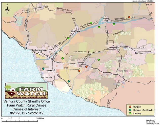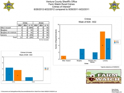 FARM WATCH: August - September 2012 Edition WELCOME FARM WATCH READERS! I can't believe it is the Fall season already and we are still experiencing "summer " heat for our county. We have very dry conditions, so needless to say we all need to be diligent in reporting suspicious activity on and around our agricultural properties to safe guard against arsonists. Please DO NOT hesitate to call 911 when you suspect person(s) that do not have the legal authority to be on your property . This is the case for those that might be casing the ranches for potential metal thefts or they could be possible arsonists. On the crime front, Det. Ray Dominguez has been quite busy all around the county, but is pleased with the readers of Farm Watch reporting crimes in an expedient manner. I continue to receive calls from folks that want to be added to this report. SO the bottom line: we depend on all of you to report suspicious activity immediately so we can deliver more effective policing to solve crimes, or at least deter crime in the future ! Agricultural Crimes Detective CONTINUED » |