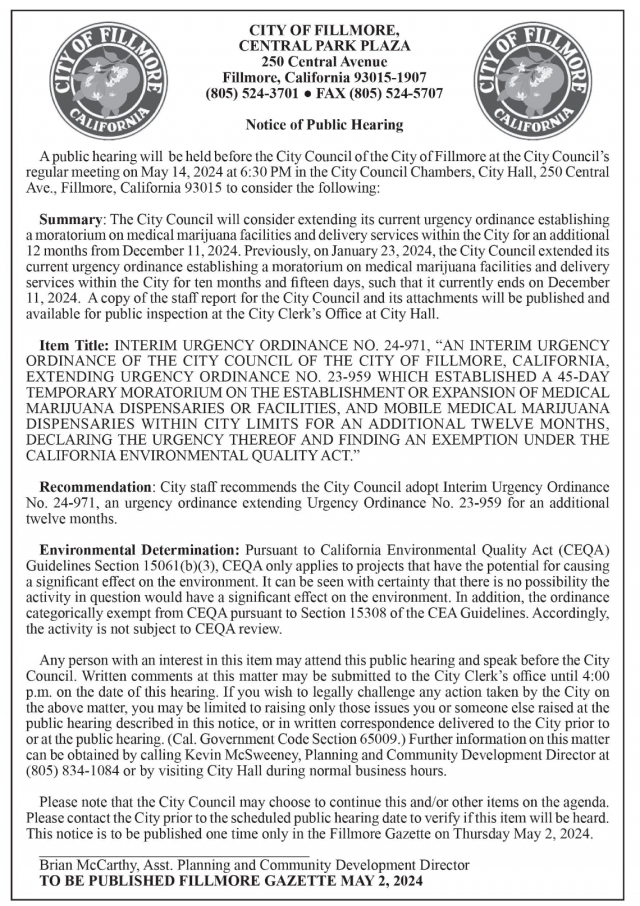 Board of Directors Meeting, Thursday, April 18, 2024, 4:00 p.m at City of Fillmore City Hall Council Chambers 250 Central Avenue, Fillmore, CA 93015 |