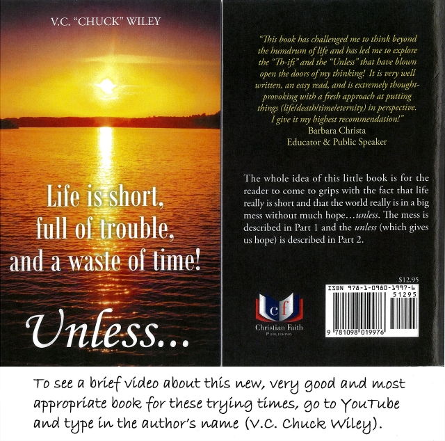 The book is titled Life is short, full of trouble, and a waste of time! Unless … Wiley says the whole idea of this little book (only 70 pages) is for the reader to come to grips with the fact that life really is short and that the world really is in a big mess without much hope. . . unless. So he asks the question, “Why are we here and what happens when we die?” Part 1 presents his thoughts regarding the world and humanity, and Part 2 explores the “unless” which provides hope for both the present and future life. Barbara Christa, educator and public speaker said, “This book has challenged me to think beyond the humdrum of life and has led me to explore the ‘Th-ifs’ and the ‘Unless’ that have blown open the doors of my thinking! It is very well written, an easy read, and is extremely thought-provoking with a fresh approach at putting things (life/death/time/eternity) in perspective. I give it my highest recommendation!” Just a few months after graduation, Chuck joined the US Air Force and served four years. After that he started his college education at Pacific University in Forest Grove, Oregon, then finished with a BA degree in Sociology/Criminal Justice at The University of Texas in Arlington, Texas. He has served as both a juvenile and an adult probation officer; operated an emergency shelter for children for CPS; was director of a facility for the homeless; has been a teen court coordinator; started and operated a facility for developmentally challenged adults; worked with the Boys and Girls Clubs of Fort Worth, Texas; and taught in public schools. He has also written technical manuals describing how to operate and repair fighter jets, helicopters and postal equipment. In addition to the book, which is available from Amazon and Barnes and Noble, he has written parenting material for parents and character development material for kids that has been used by thousands in social service agencies, schools and the courts in Texas, Arkansas and Missouri. Feel free to contact Chuck by email at cwiley@kitcareserv.com or by phone (817)479-6321 (it’s a land line). |