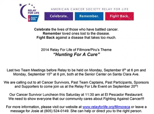 "September 20th will be here before you know it. That is the day Team Namaste is participating in Relay for Life. This is a 24 hour event our team has participated in for several years. We do this to support those who are battling cancer, honor those who have passed away and last but not least try to raise money to help with cancer research and programs that the American Cancer Society has developed to help those suffering with cancer. To date our team has raised over $4,000 . . . but we're not done yet. I'd like to thank several Fillmore vendors who are helping our team by showing some baskets our team is raffling off for this event. The vendors are: We also have a USC basket, a Raiders basket and a frozen basket. The tickets are selling for 3 tickets for $5.00. We will continue selling the tickets through Saturday, September 20th and will pick the winners at the Relay for Life event. If you are interested in purchasing some tickets you can contact Lola Rogers (team captain) at 805-276-9274. Our team would like to thank you in advance for your support. |