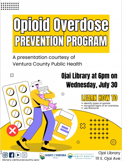 Staff from Ventura County Public Health will visit the Ojai Library at 6pm on Wednesday, July 30, 2025, to provide a training The Opioid Overdose Prevention Program provides a wide range of information regarding opioid related topics. Attendees will This event is free and open to the public. For additional information, contact Ron Solórzano, Regional Librarian, at (805) The Ojai Library is located at 111 East Ojai Avenue in Ojai, CA. Hours of service are 10am to 8pm Monday through Thursday and CONTACT: Ron Solórzano, Regional Librarian, (805) 218-9146 |