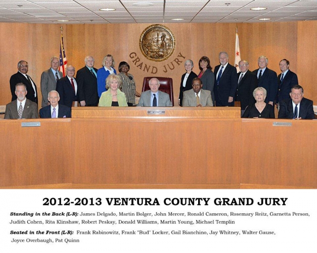 The 2012-13 Ventura County Grand Jury’s completed investigations to date appear in published reports on-line at the website: http://grandjury.countyofventura.org. There are other pending investigations that may result in additional reports. If more reports are published before the end of the 2012-2013 term, those reports will be available on-line as well. June 28 is the last working day of the term for this current Grand Jury, at which time applicants for the 2013-2014 Grand Jury will attend an orientation meeting presented by the 2012-2013 Grand Jury. The official photograph of the 2012-2013 Grand Jury panel is attached. The new Grand Jury will be selected and sworn in on July 1, 2013, at a ceremony in the Hall of Justice at Government Center. The civil Grand Jury is charged with the oversight of all aspects of the county and its ten city governments, special districts and agencies to ensure that the best interests of Ventura County citizens are being served. To find out more about the mission of the Grand Jury, to download complaint forms, and to view previous years’ reports, visit the website. |