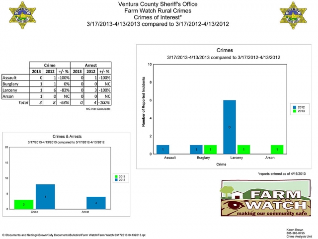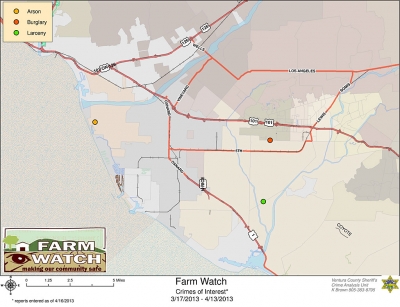 Message from Detective Ray Dominguez: Folks, I’ve got just a couple things to report in this edition of Farm Watch. First, I want to mention a recent success story involving an arrest and recovery of stolen horses and tack. In March, Senior Deputy Marc Cargnel of the Camarillo Police Station worked with a victim who reported having his horses and tack stolen from a ranch located off Highway 118 in the Somis area. Marc received information from a diligent victim who had been conducting some follow-up investigation of his own. The victim reported that he had located what he believed to be his own stolen horses, and those of another victim he knew had horses stolen recently as well. Through further investigation, Marc was able to establish there was sufficient probable cause to make an arrest. Marc arrested the suspect and recovered several horses, stolen saddles, and other tack from the location in the unincorporated area of Camarillo. It just goes to show how working together we can accomplish great things. Great job by all parties involved! On a second note, it appears that thefts of fertilizer/pesticides have begun this season. I have already seen one report come in within the last couple of weeks. This case involved the theft of over $20,000 worth of various pesticides and fertilizers stolen from a ranch in the unincorporated area of Oxnard. There are no suspects identified in this case, and little in the way of physical evidence. Please take this as a reminder to not stockpile your supplies, and order only what you intend to apply. These steps will help you from becoming the next victim of such a theft. If you have questions about site security and need help, please don’t hesitate to give me a call at (805) 384-4726. Anyone with information CONTINUED » |