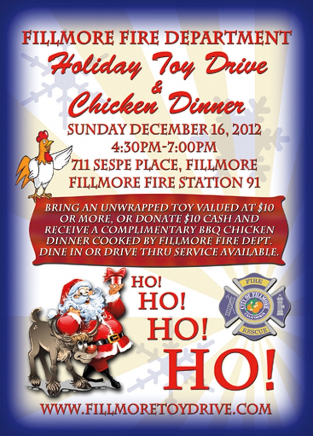 The Annual Toy Drive Sponsored by City of Fillmore Fire Department is underway! Unwrapped toy donations are currently being accepted at Fillmore Fire Station 91 located at 711 Sespe Place, Fillmore. All residents who donate a new unwrapped toy valued at $10 or more, or make a $10 cash donation will receive a ticket for one BBQ chicken dinner. The BBQ will take place on Sunday December 16th, 2012 between the hours of 4:30PM â 7:00PM. Dinner will be served at the Fire Station or you may take advantage of our convenient drive thru service. Toys will be distributed to Fillmore children on Wednesday December 21th, 2:00pm at Fillmore Fire Station 91 located at 711 Sespe Place, Fillmore. Hundreds of families in Fillmore struggle to put food on the table and pay rent each month leaving many without money to buy gifts during the holiday season. With your assistance you can help bring a smile to a childâs face this Holiday Season! Toy Drop-off Locations: Fillmore Fire Department Fillmore Police Department |