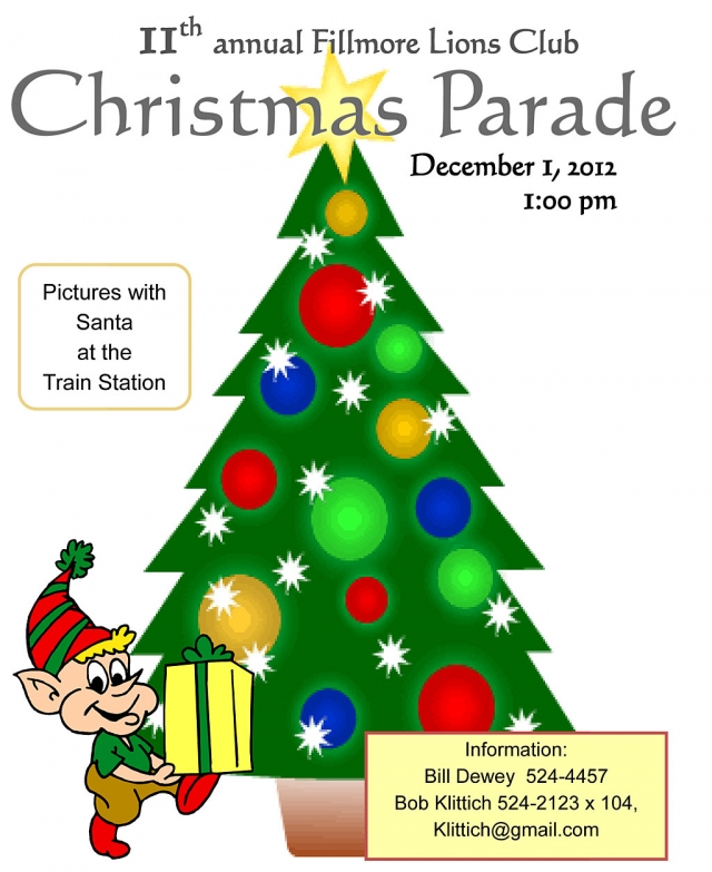 Merry Christmas! Itâs time again for the 2012 Annual Fillmore Christmas Parade sponsored by the Fillmore Lions Club. On Saturday December 1st at 1:00 PM the parade will proceed south on Central Ave. from Second Street to Santa Clara Street. The parade route will be posted with âNo Parking Signsâ from 11:00 AM to 3:00 PM the day of the parade. The Lions Club requests the cooperation and patience of Fillmore residents for this event to ensure the safety of all involved. The Parade is open to all groups or persons wanting to celebrate the season with a âthemedâ entry. Applications are available to print below and at several locations: There is no cost to enter the parade. Parade check-in is at 11:30 AM on Second Street, in front of the Memorial building. This is the 11th year the Lions Club has sponsored the Annual Fillmore Christmas Parade. The Fillmore Lions Clubâs continues to sponsor the parade in honor of long time member, the late Henry âHankâ Carrillo. Hank urged the Club to assume the responsibility of the parade when it was in danger of losing sponsorship. Santa Clause is expected to be in Fillmore to wish all a Merry Christmas in time for the Parade. Immediately after the parade Santa will be available for pictures, (if you bring your own camera), at the Fillmore Museum, near the train station. See you all on December 1st! Bob Klittich http://www.scribd.com/doc/113137772/Parade-Application-2012 http://www.scribd.com/doc/113137741/Hold-Harmless-Parade http://www.scribd.com/doc/113137733/FAQ-Frequently-Asked-Questions-2012 |