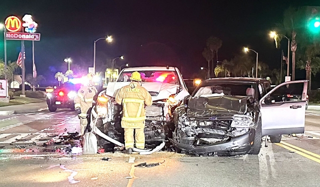 On Saturday, April 26th, at 9:00 p.m., the Fillmore Police Department, Fillmore Fire, and AMR Paramedics responded to a reported two-vehicle accident near the intersection of Ventura Street and B Street. When firefighters arrived, they found two pickup trucks with moderate damage; one patient was transported to a local hospital in unknown condition. One of the drivers was arrested for drinking and driving and booked into the Ventura County Main Jail. Photo credit PHOTO91.
