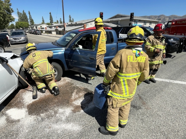 On Tuesday, July 8th, at 3:27 p.m., the Fillmore Police Department, Fillmore City Fire, and AMR Paramedics responded to a two-vehicle accident near the intersection of River Street and A Street. Arriving firefighters discovered two vehicles in the middle of the intersection with moderate damage and a total of three patients; no ambulances transports were made. Photo credit Angel Esquivel.