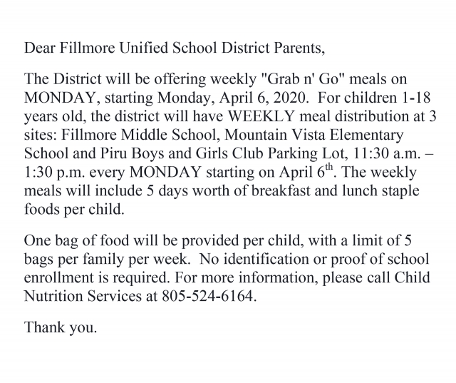 - Communication regarding the meal distribution can be found on the district website, www,fillmoreusd.org or via Blackboard Connect Ed messages