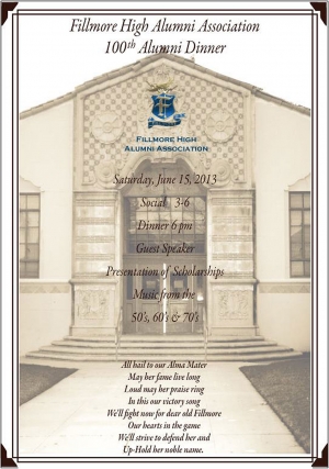 Can you believe it’s here? The current Board Members of the Association started talking about this evening two years back. In fact, they started working on this celebration back then. On June 15th, 2013, all the hard work of putting on this celebration will come together, as Alumni from across the country and California will make their way to the Veteran’s Memorial Building for an evening of Laughter, Good Food, and Memorabilia from 100 years of our beloved Fillmore (Union) High School. The celebration starts at 3:00pm with “Social Time” in the Building, and Patio area. Inside, there will be beautiful Pictures hung of each Class starting with the first Graduating class of 1911. Did you know that the first class consisted of only 4 graduates? Mable D. Arthur, Mary E. Cummings, Sarah N. King, and Albert G. Wiklund. Out on the Patio area you’ll be able to enjoy a cool drink and, and seek out that old friend from years past. Also, out on the Patio area will be Hors d’ oeuvres, (for the early arrivals) of Domestic and Imported Cheese Display with Crackers, and Garden Vegetable Display with Dip. 6:00pm brings us the Welcome, and Greetings, from a few Board members, and then it’s time to enjoy a wonderful dinner presented by DJ’s California Catering. The Menu: After a wonderful dinner, we will have a short program with our guest speaker, The Chancellor from U.C. Merced, Dr. Dorothy Wilson Leland. She is a Fillmore High Graduate, from the Class of ’1966. We (Current Board members) could go on all night and talk, however, we realize that this special evening belongs to you. The great Folks who have supported the Organization for the past 100 years, and who have come from so far away to catch up with old friends, so rest of the evening is yours to enjoy through the night. Inside there will be music from the 1950’s, 60’s, and 70’s, and out on the Patio you’ll be able to continue your socializing, and reminiscing of the good old days at Fillmore (Union) High School. Be sure to print out a dinner reservation form here by visiting the Alumni website at www.fillmorehighalumni.com or call the Alumni Office, and they’ll mail one out to you. 805-524-0146. If you live in and around the Fillmore Area, you can always drop in at Patterson’s Hardware store in beautiful Downtown Fillmore, and pick up a dinner reservation form there. Fillmore High Alumni Association: Onward, and Upward to the next 100 years!!! |