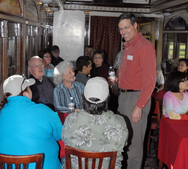 ![]() From left, former Fillmore Mayor Don Gunderson, former City Manager Roy Payne, former City Engineer (Director of Public Works) Bert Rapp and his wife Renee board the special train at city hall waiting to take them to a farewell party. Rapp resigned his position after 19 and a half years with the city. Approximately 40 friends, former colleagues and fellow employees gathered for a bar-b-cue at a private residence. Enlarge Photo |