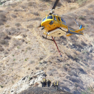 ![]() On Thursday, August 7th, 2025, at 7:30am, multiple fire crews responded to a fire near Holser Canyon Road, north of Piru. Later named the Canyon Fire, residents were able to see plumes of smoke fill the air as they watched crews head towards the fire. Above is a photo taken from the Arco Gas Station off Highway 126 in Piru. Photo credit Marcus Camp. Inset, a helicopter making a water drop. They can drop 1,000 gallons (about 3,785 liters) of water at once, some much more, and can be the best way to attack fires that are difficult for ground crews to reach. Photo credit Sebastian Ramirez. Enlarge Photo By Gazette Staff Writers — Saturday, August 16th, 2025
