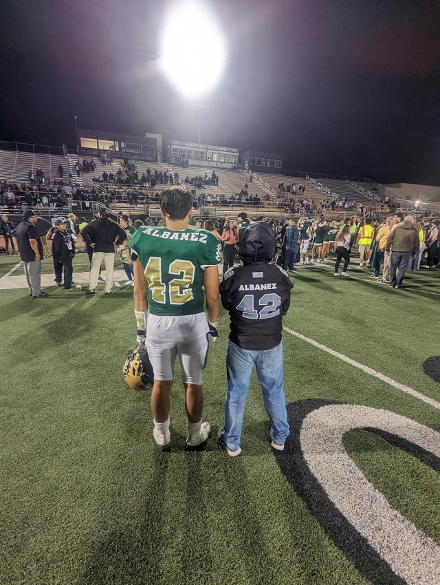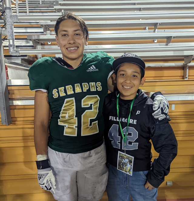 ![]() The Fillmore Raiders Juniors Silver Team was invited to St. Bonaventure's Homecoming football game, as they are 5-0! It was a special moment for Mikhale Albanez #42 as he joined his cousin Anthony Albanez #42 who is a senior at St. Bonaventure on the field. Albanez's finishing tackle after an initial stand-up hit on a two-point conversion attempt with 15-seconds remaining enabled St. Bonaventure to kick off defense of its Marmonte League title by defeating Bishop Diego, 21-20 on Homecoming night Friday, September 30th at Ventura College. Enlarge Photo |