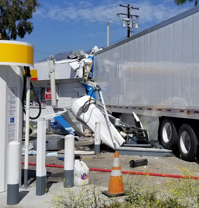 On April 19th, 2022, at 10:14 a.m., the Fillmore Sheriff’s Office, Fillmore Fire Department (ME191), Ventura County Fire (RE27) and AMR Paramedics were dispatched to a reported semi-truck into the Shell Gas Station located at Ventura Street (SR-126 )and Santa Clara Street. According to Fillmore Fire Chief Keith Gurrola the semi was traveling westbound on Ventura Street, drove through a power pole and a large Palm tree, crashed into a parked car and struck at least two diesel gas pumps before crashing into the east side of the station, stopping half way in. A male patient suffered minor injuries and was transported to the hospital by AMR Paramedics--the store clerk was not injured. The gas station attendant acted quickly to shut down all the gas pumps before exiting the building, according to Chief Gurrola. There were no spills from the pumps, but the semi's 40-gallon tanks were ruptured and the store was red tagged by Building & Safety. Edison and SoCal Gas inspected the sight for powerline and natural gas issues-- none were immediately found. Fillmore Sheriff ’s Office is investigating the crash. Information courtesy Angel Esquivel-AE News.