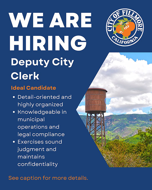 The City of Fillmore is seeking a detail-oriented and highly organized professional to join our City Clerk’s Office as Deputy City Clerk. This key role supports City Council operations, maintains official records, ensures legal compliance, and helps uphold transparency in local government. If you’re passionate about public service, governance, and supporting elected officials, we encourage you to apply. Learn more and apply at www.fillmoreca.gov.