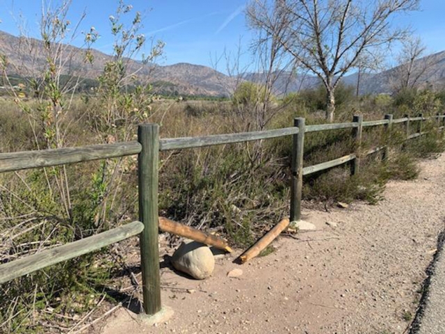 | By Anonymous — Wednesday, April 14th, 2021  Fillmore’s scenic bike paths are in need of repair. Vandals have damaged the wood posts along the path to the north of the City’s water reclamation plant and running along the east side of the Sespe River heading into north Fillmore. Graffiti, trash and canine waste are also a problem along the paths. Enlarge Photo |