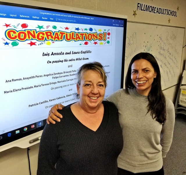 ![]() Fillmore Adult School Learning Center kicked off the holiday season by celebrating the many students making progress towards earning their high school diplomas and equivalencies. Laura Castillo and Luis Arreola (right) have recently passed the entire Hiset exam! Enlarge Photo |