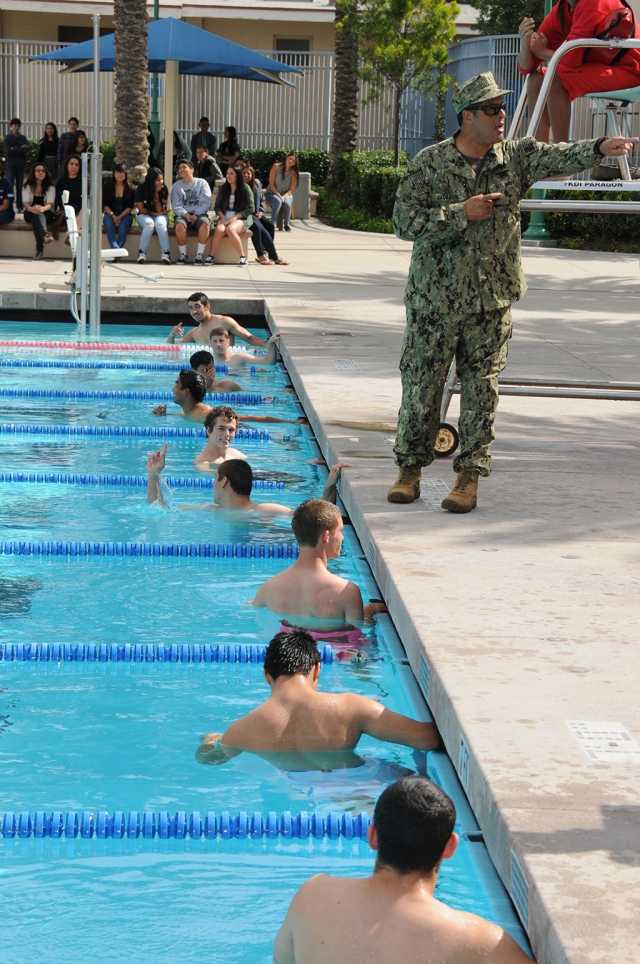 ![]() The United States Navy SEALs came to Fillmore last Wednesday, March 5th to run about four dozen Fillmore High School Juniors and Seniors through some rigorous military exercises. School administrators and members of the PTO attended for support. Several SEALs addressed 46 students, male and female, stressing they are interested in students from all backgrounds. Women cannot serve in the SEALs. Chief James Johnson and Recruiter Anthony Jimenez were just two of the SEALs who oversaw swimming five laps in five minutes, running a mile in seven minutes, and completing 15 pushups, 45 situps, and two pullups, all within two hours.One of the top five qualifiers, Chad Petuoglu, a FHS junior, ran a 7-minute mile, swam five laps, and completed eight pullups, 67 pushups, and 60 situps. FUSD Superintendent Alan Nishino visited the SEALs last year at the Amphibious Base Coronado, San Diego. SEAL MOTTO: âThe only easy day was yesterday.â Enlarge Photo |