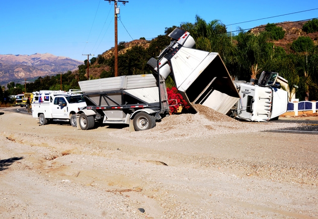 On Tuesday, November 10th at 1:46pm, in the 1700 block of Grimes Canyon Road in Bardsdale, a belly dump truck carrying a full load of gravel, and a grey Toyota Camry collided causing the truck to roll on its side, blocking lanes in both directions. The Camry had severe front-end damage. Cause of the crash is still under investigation. Lanes were to be impacted until possibly 10pm according to the California Highway Patrol.