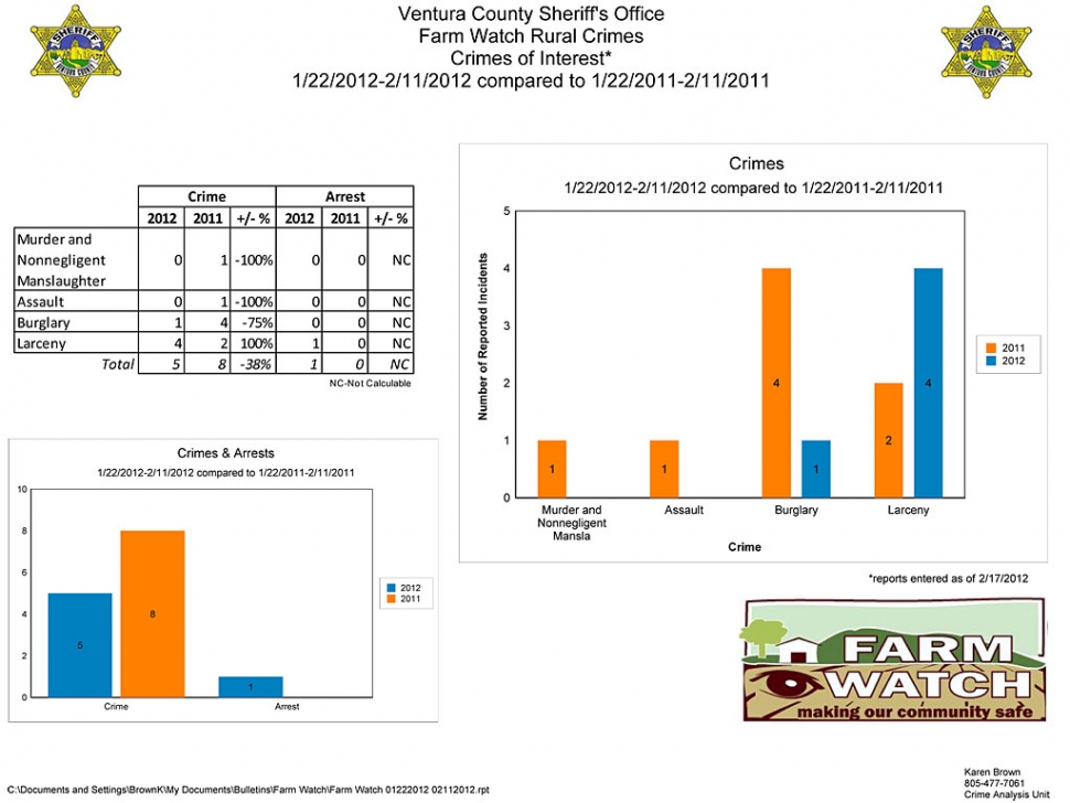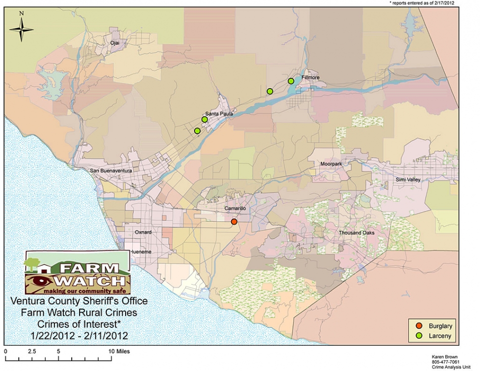 ![]() FARM WATCH: JANUARY - FEBRUARY 2012 ISSUE I am pleased to report that this edition of Farm Watch has a bit of good news to share given the multiple arrests made county-wide for metal thefts. The overall crime rate for this period vs. the same time period last year shows a decrease. Below is just an example of some fine team work with our deputies and ranch employees: On February 7th Deputy Peterson (Fillmore Police and Sheriff) made an arrest involving a copper wire theft / trespassing. Employees at a ranch on the 3700 block of Sycamore Road in Fillmore observed 2 subjects on the property stealing a 40' long power cord comprised of copper wire. The employees confronted the subjects and the subjects dropped the power cord and fled in a white older model Toyota pickup truck (License 6L08685 / CA). The employees called dispatch and gave a description of the vehicle (including the license plate number) and the subjects, as the employees tried to follow the subjects on the SR 126. Because of morning traffic on the SR 126, the employees were not able to continue following the Toyota as it drove westbound. Sgt. Juan Ponce of our Ventura Station ultimately located the Toyota pickup truck in the rear yard at 11396 Nardo Street in Saticoy. One subject that Sgt. Ponce was able to identify fled on foot, but he was able to detain the other suspect. Deputy Peterson did an in-field lineup and the employees for this Ranch were able to positively identify the subject detained as the person that was stealing the power cord and driving the white Toyota pickup truck. The suspect was arrested and booked at our Main Jail in Ventura. GREAT WORK BY ALL!! Because of the observant employees, their quick response, and detailed reporting of the incident (Toyota truck license plate number and suspects descriptions) to dispatch, deputies were able to locate and arrest one of the suspects and identify the second. This was a job well done by all involved (law enforcement and witnesses / victims). As a solid reminder for everyone, with quick and detailed reporting we can and will catch the thieves. This is prime avocado season and the thieves are out and about. The unincorporated areas all around the county have been hit. Please call in suspicious vehicles, persons, oddities, etc. so we can respond. Some of our deputies did catch a few avocado thieves, however, there were far more thefts than arrests in this crucial area. Agricultural Crimes Detective Ray Dominguez had the following to add to this edition of Farm Watch: Strawberry growing season is in full swing and over the past couple of weeks several pesticide thefts have been reported at local farms in the Camarillo and Oxnard areas. Historically, thieves begin targeting local farms at this time of year to steal materials that are both expensive and in high demand on the black market. The materials stolen commonly include pesticides, fertilizer, drip tape, and other equipment used in berry production. The thefts typically occur at night, and often get reported following a long holiday weekend, as thieves know that farm crews may not be working and the theft will go undetected for several days. I’ve also found that these thefts occur within a few days of the product being delivered to the farm. Investigating these thefts can be challenging as many of these products are not marked for identification and can easily be transferred to other unmarked containers to hide the contents. I’ve also found on occasion that victim’s suspect their own employees of providing information or actively participating in the theft, as they are intimately familiar with the farm operation. The fact that many farms share access to the property with their neighbors makes it difficult to track activity on the farm as different growers have varying schedules for their employees and people are constantly coming and going. I suggest you consider taking the following steps to help protect your farm from theft: Maintain all fences and keep gates locked. In addition to chemical thefts, we have started seeing avocado thefts on the rise with reports of several petty thefts and one grand theft from the Santa Paula / Fillmore area. Kudos to the Fillmore Station deputies as they have made a couple of arrests in connection with the petty thefts, but no suspect(s) have been identified in the grand theft. This leads me to comment on another avocado theft just reported in the Moorpark area that occurred on the evening of February 20th in which a property owner was attempting to protect his property. I can’t get into the details of this case as it is actively being investigated by the Sheriff’s Office. What I can share are some words of wisdom about how you should handle this type of situation. I want to emphasize that you should avoid confronting suspects on your own and only serve as a good witness. This incident highlights the fact that you just never know who you will encounter on your property, and the lengths suspects will go to avoid capture. I highly recommend that you use the guidelines listed below if you observe a crime in progress: Call the Sheriff’s Office immediately at 911. Following these guidelines will help keep you safe and provide important information to responding deputies in a timely manner. Remember property can be replaced…lives can’t! Be smart and stay safe, Detective Ray Dominguez Ventura County Sheriff’s Office – Agricultural Crimes Unit Great words of advice from Ray..... Also as a reminder: Please mark your equipment for identification. Please preserve the crime scene by keeping employees and vehicles out of the area until deputies arrive to process the scene. Please report criminal activity as soon as possible to increase the probability of recovering stolen If you are not sure of how to address the problem or would like additional crime prevention tips please contact your local Sheriff’s Office substation or Detective Ray Dominguez directly at (805) 