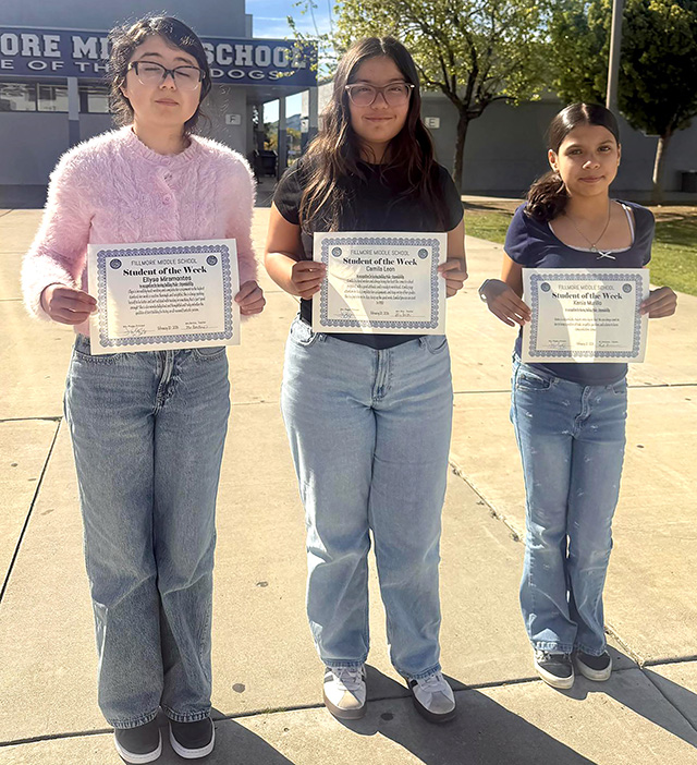 Fillmore Middle School Principal Jenny Plugge said, “We want to celebrate our students of the week for February 6th. Alexx Alanis-Martinez, Lupita Lara, and Steven Dominguez. Congratulations to these Bulldogs for demonstrating Bulldog Pride.” |