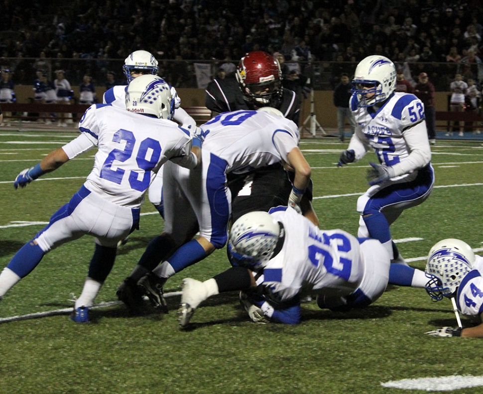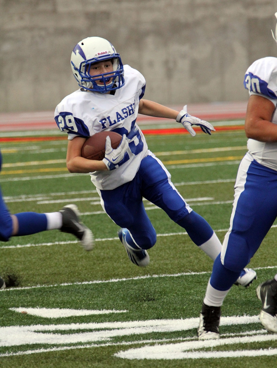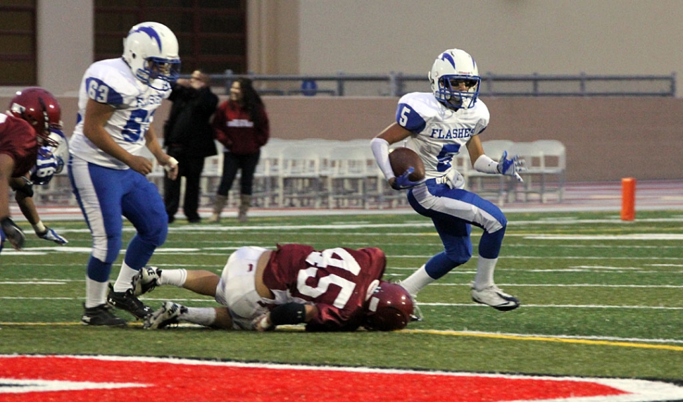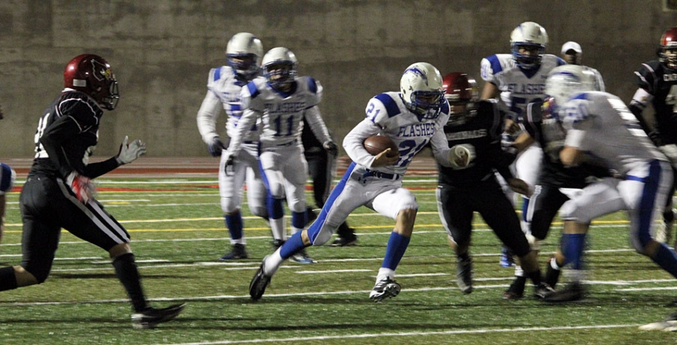 ![]() Fillmore 23, Santa Paula 26 - Collin Farrar #4 (above) scored one touchdown, 25 carries for 181 yards. Robert Bonilla also contributed one touchdown. During the 4th quarter Tyler Esquivel on Defense tied the game with a 40-yard touchdown that led into the double overtime. Fillmore Flashes came up short against Santa Paula but not without a fight. Both teams played with alot of heart. Photos courtesy of Crystal Gurrolla. ![]() ![]() ![]() Fillmore 56, Santa Paula 20 - Fillmore Flashes finished off the season with a huge victory over the Santa Paula Cardinals. Fillmore was lead by Eddie Cardenas who rushed 25 times for 317 yards and 3 TD, on Defense he also had an interception. Also pacing the Offense was Adam Jimenez who rushed 25 times for 177 yards and 4 TD. He also had an interception on Defense. Finishing off the scoring was Carson Mclain who had 1 TD and a 2 point conversion. The Offensive line played a key role in the runningbacks being so successful; they are led by Brendon Gonzalez, Damian Almazan, Chad Petuglou, Jonathan Munoz, Adael Mejia, and Aaron Cronin. On Defense Hayden Wright was able to come away with two interceptions. The Flashes finished second in Tri-Valley and an overall record of 8-2. ![]() ![]() ![]() |