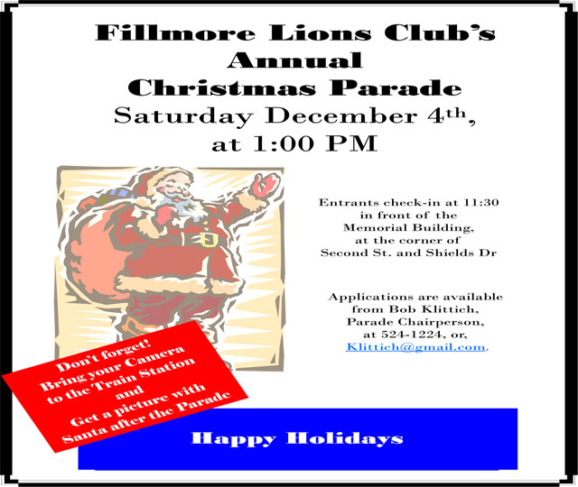 The Fillmore Lion’s Club Annual Christmas Parade is coming up Saturday, December 4 and it’s not too late to sign up. The parade starts at Central and Second Street at 1:00 pm. It will go down Central to Santa Clara Street. Check in will start at 11:30 am in front of the Memorial Building at Second and Shields Drive. After the parade, Santa will be available for pictures at the train station. Bring you own camera. |