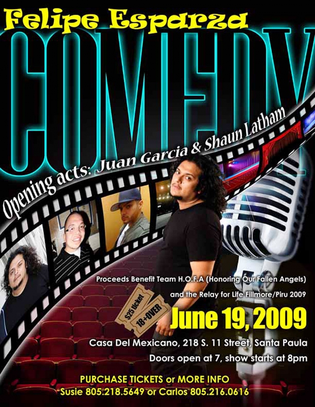 Show will be a 2 hour event with Juan Garcia and Shaun Latham as opening acts and headlining the show will be Felipe Esparza. Felipe Esparza is best known for his raw, real-life comedy that all audiences can relate to. He is also known for his wild hair and his often-imitated phrase, "what's up, fool?" He is one of many new comedians that got immediate television exposure, when he appeared on a Showtime, "Diamonds in the Rough" segment, just 1½ years into his stand-up career. Since that time, he has appeared on numerous television shows, including ABC's "Comics Unleashed", Showtime's "Comics Without Borders", BET's "Comic View" and "One Mic Stand", and Galavision's "Que Locos" (where he holds the title of most appearances by any comedian). He has also completed filming on his first feature-length film, "The Deported" directed by Lance Kawas and starring Nick Turturro and Paul Rodriguez amongst others. Show will be at the Casa Del Mexicano in Santa Paula on Friday, 19 June 2009. Doors open at 7:00 pm; show runs from 8 to 10 PM. The event cost is $25 a ticket and is for adults 18 and older. You can call or email Susie at 805-218-5649 or suzortega@yahoo.com. |