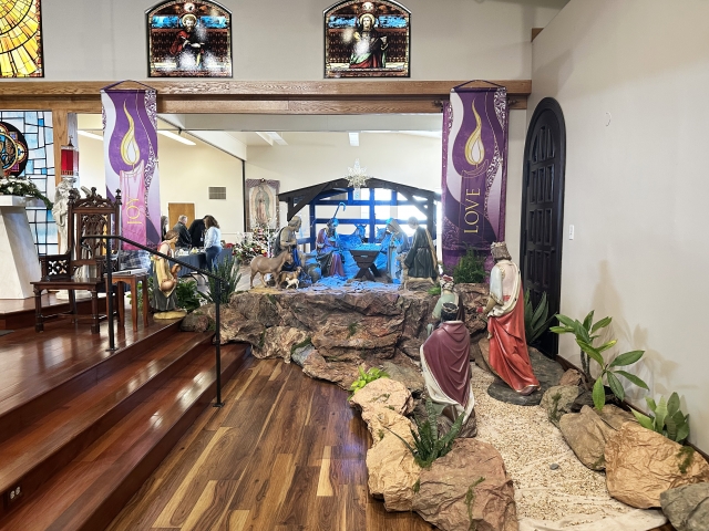 ![]() Saint Francis of Assisi Roman Catholic Church held their yearly Christmas Advent manger display on Sunday, December 15th. Pictured is the life-size manger in the main sanctuary, presenting the holy family at Christ’s birth. Inset, one of the many manger scenes available for viewing. Photo credit Gazette staff. Enlarge Photo |