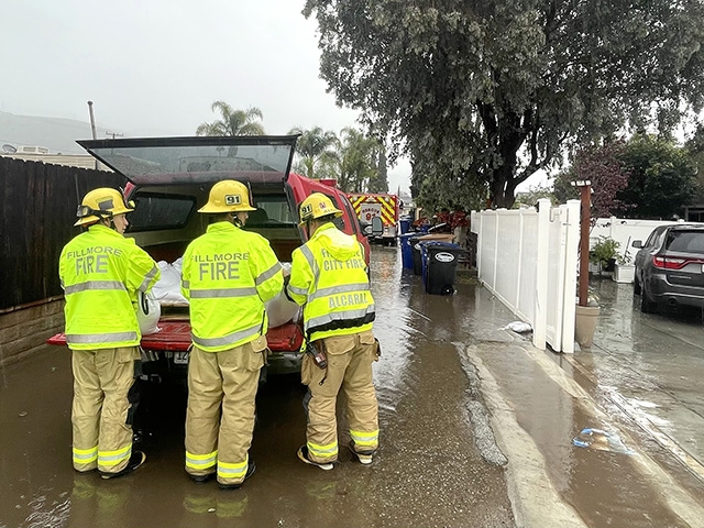 On Saturday, January 3, the Fillmore City Fire Department responded to a flooding report in the 900 block of Blaine Avenue. Firefighters assisted in unloading sandbags for placement to prevent further flooding to the property. Photo credit Angel Esquivel. |
