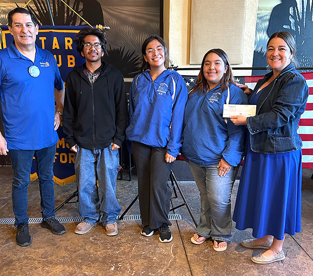 Pictured above is Fillmore Rotary President John Garnica with FHS Swim Team’s Jesse Cavazos, Kiana Toyota, Alina Cruz, and Coach Hannah Faith. Not pictured is James Alcantar presenting them with a donation check for $500. Photo credit Martha Richardson. |