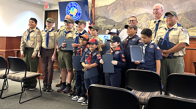 On Tuesday, February 10, Fillmore Mayor Albert Mendez and the Fillmore City Council recognized Scouting America Troop 406 and Cub Scout Pack 3406 with proclamations in honor of the 116th Anniversary of Scouting, and with individual certificates of appreciation for their annual community service efforts and commitment to scouting. Scouting America Troop 406 is sponsored by the Fillmore Lions Club. Cub Scout Pack 3406 is sponsored by Fillmore Rotary. Photo credits Jeff Peterson, Michael Slover, Cameron Stevens.