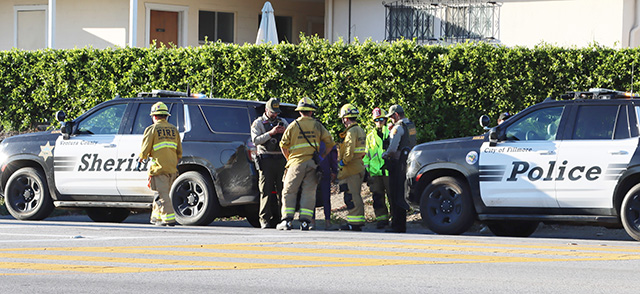 On Friday, November 28, at 3:06 p.m., Fillmore Police Department, Fillmore City Fire, and AMR Paramedics were dispatched to a reported vehicle versus pedestrian at the intersection of Ventura Street and Mountain View Street. One patient was transported to a local hospital, condition unknown. Photo credit Angel Esquivel. |