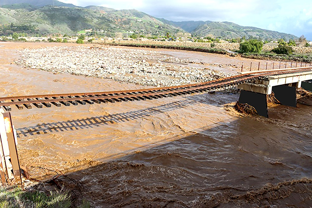 ![This photo was taken on January 5, 2023, the day before the railway bridge fell at Old Telegraph Road and C Street. Fillmore resident Christopher Reilley took the photo. “It rained even harder that night. It [the train] was blaring its horns so we came down to the tracks to see, maybe he detected it was about to fall. We live nearby and could see the river getting larger and larger. Eventually the split in the river became one by the bridge.” Photo credit Christopher Reilley. Inset is the collapsed railway tracks taken shortly after Mr. Reilley captured the last train to cross over Sespe Creek. Inset photo credit Angel Esquivel.](/files/imagecache/640wide/files/The-Last-Train-02-05-2026-1303.jpg)