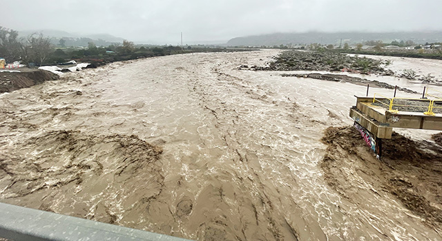 Pictured is a drainage culvert on the east side of the Sespe River, at Old Telegraph Road, used to handle normal drainage. It was closed last week in anticipation of possible overflow from the Sespe River. The flap gate was installed on January 9th, 2023, by Ventura County Public Works. Aluminum slats were lowered into rails on the side of the culvert to create a barrier. The Sespe River has a riprap levee, a permanent layer of large, angular stone or boulders, mixed with cement, typically used to stabilize and protect the soil surface against erosion and scour in areas of concentrated flow. Stop logs are used for level control in open channels of the river. Logs are beams inserted in grooves cast in a channel wall; typically, nominal height of a stop log is in 6” increments, i.e., the log can be 6, 12, 18” in height, etc. Photo credit Angel Esquivel. |
