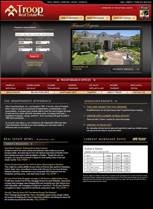 SIMI VALLEY, CA – Responding to the increased needs of consumers in an ongoing challenging housing market, Troop Real Estate, Inc., announces the unveiling of a new “go to” website tailored to assist home buyers and sellers with current market news, along with refined traditional online features. Jeff Jarrard, who heads up website development for Troop Real Estate, Ventura County’s largest real estate firm with offices in Santa Clarita and San Diego, reports that the totally revamped site, accessed via www.troop.com, features the core property information consumers are accustomed to viewing, enhanced by vital market data to help them make important decisions. “We have re-created our website to be more valuable to consumers because we realize the need for more information in today’s market, including the latest mortgage rate updates and general real estate trend news,” Jarrard said. He reported that among the new website features are: “The primary purpose of the new website is to reflect Troop Real Estate’s goal of achieving 100 percent client satisfaction. Our new site provides more than just what our business offers, but a “go-to” site designed for the consumer’s benefit. Daily real estate news updates, mortgage information, rate updates and a vast amount of general information are all in one place for our clients,” Jarrard said. He added that the new site also features a custom “video stream”, a framed video page of current news and trends covering both national and local real estate markets. Videos are updated on a regular basis and cover a diversity of residential real estate information. Visitors to the new site who had been accessing www.troop.com, Jarrard emphasized, are asked to simply re-register via an easy to use link at the upper right hand corner of the site. Registering is quick, allowing users to take full advantage of all of the site’s features, he said. About Troop Real Estate, Inc. Troop offices are located in Simi Valley, Simi/Wood Ranch, Simi (Commercial), Thousand Oaks, Westlake Village, Moorpark, Camarillo, Channel Islands, Ventura, Santa Paula, Fillmore, Ojai, San Diego and Santa Clarita. |