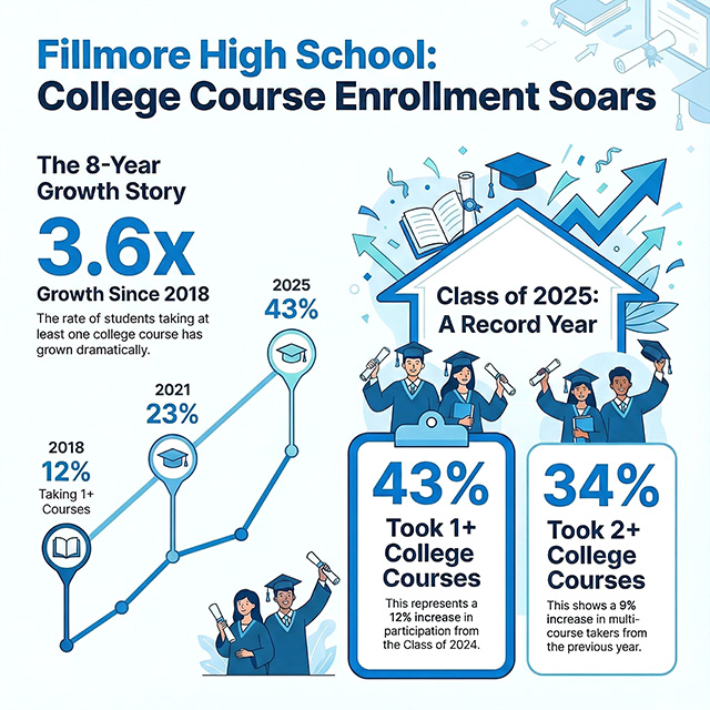 Fillmore Unified School District’s Director of Secondary Education, Keith Derrick said, “Nearly half of Fillmore High’s Class of 2025 took college courses while still in high school—that’s 43% of our seniors earning college credit before graduation! Even more impressive: 34% completed multiple college courses, and participation has grown 3.6x since 2018. Our students aren’t just preparing for college—they’re already succeeding in it! Thank you to Ventura County Community College District (VCCCD) for partnering with us to make this possible.” Courtesy https://www.blog.fillmoreusd.org/fillmore-unified-school-district-blog/b.... |