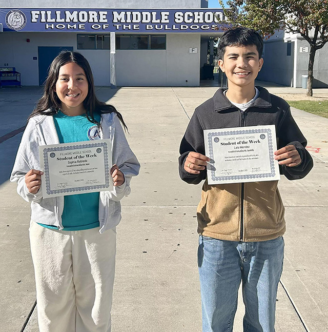 Fillmore Middle School Principal Jenny Plugge said, “We want to celebrate our students of the week for December 5th. Sophia Robledo, Lalo Mendez, and Arianna Jaimes (not pictured). Congratulations to these Bulldogs for demonstrating Bulldog Pride.” Courtesy https://www.facebook.com/photo.php?fbid=1455369249923885&set=a.103743886.... |